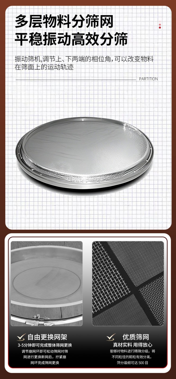 • 作用功能:筛框是旋振筛的主要参振部分。它将待加工物料约束在特定筛分范围内,使物料在筛面上进行定向跳跃式运动,确保筛分精度。同时,它还为筛网、振动电机等部件提供安装支撑,保证旋振筛的整体结构稳定性。