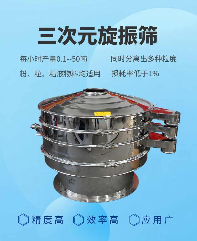本产品设计精巧,筛分精细,适用于任何粉类,粘液类的分级,全封闭式机构,无粉尘飞扬,噪音低,占地面积小,换网方便,延长筛网使用寿命,可连续作业等特点。