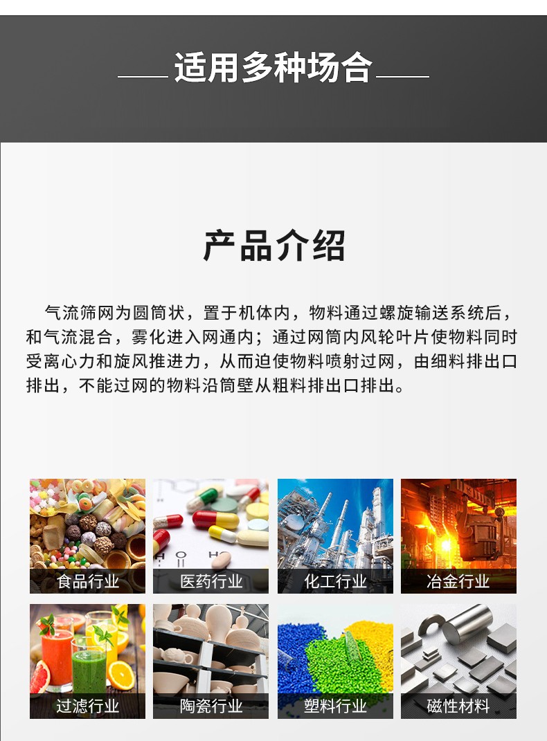 气流筛网为圆筒状,置于机体内,物料通过螺旋输送系统后,和气流混合,雾化进入网通内;通过网筒内风轮叶片使物料同时受离心力和旋风推进力,从而迫使物料喷射过网,由细料排出口排出,不能过网的物料沿筒壁从粗料排出口排出。