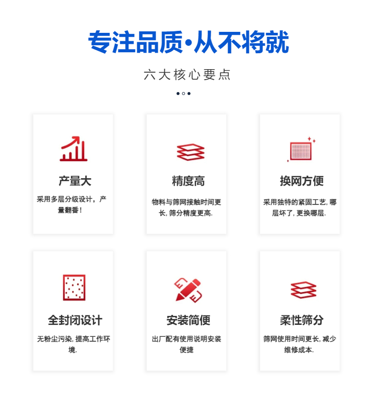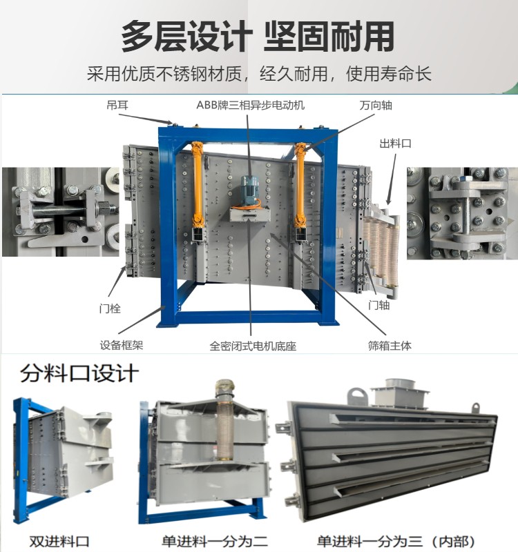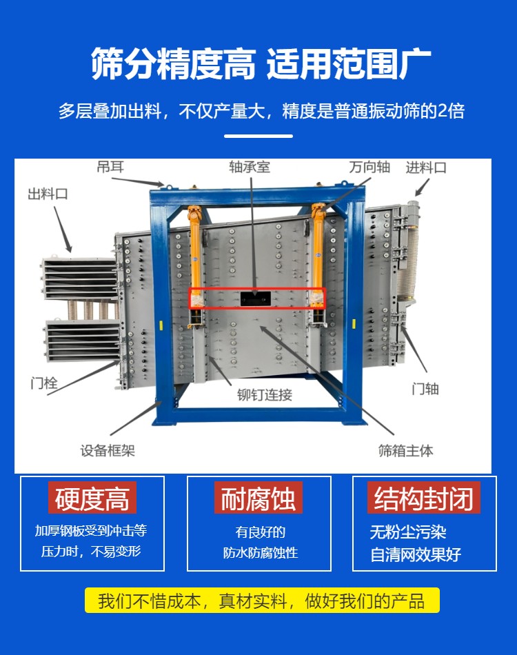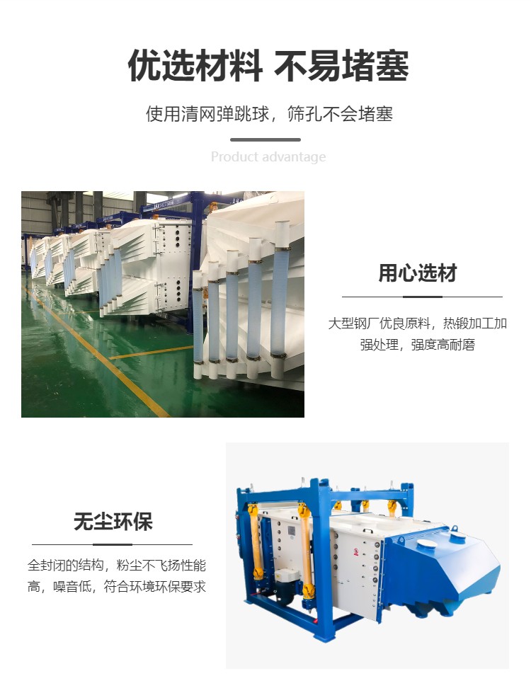 平面回转筛是一种高标准的精细筛分机,它主要是由筛箱、驱动装置、筛架、支撑架和减振装置等组件构成,该产品结构设计紧凑,主要有以下特征。